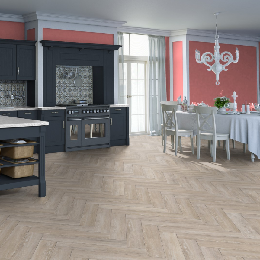 Формат планки 653,1 × 130,6 мм винилового пола Tarkett Art Vinyl из коллекции Lounge благодаря узкой удлинённой геометрии и возможности произвольного направления укладки позволяет реализовать эффектные схемы, включая рисунок «английской ёлки» (herringbone).